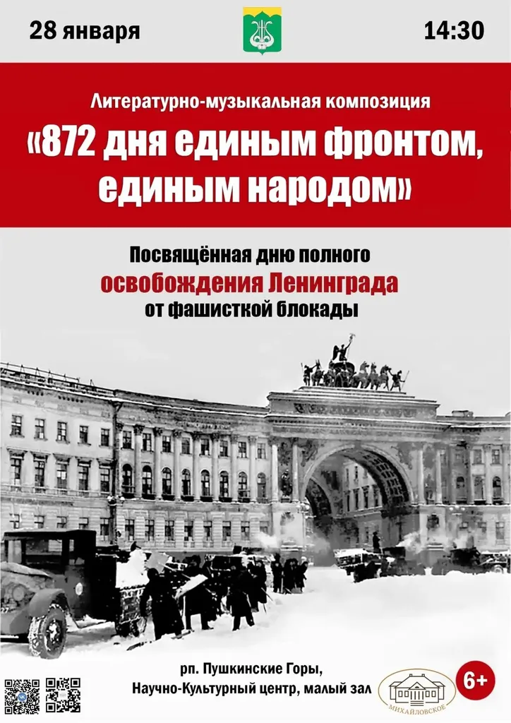 28 января в 14:30 в малом зале Научно-Культурного центра состоится Литературно-музыкальная композиция "872 дня единым фронтом, единым народом" посвященная дню полного освобождения Ленинграда от фишисткой блокады.